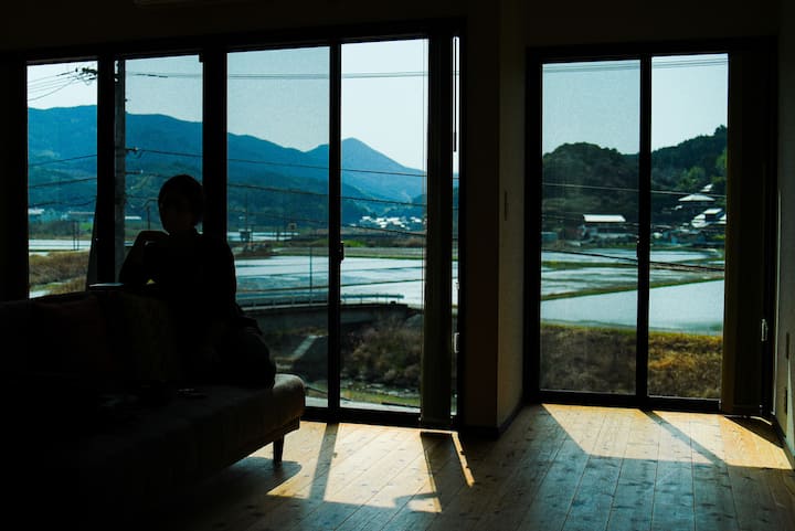 ヒノキ風呂付き1日1組貸切宿 – 小さなお子様歓迎、フルリノベで快適、リビングから田園風景を一望
