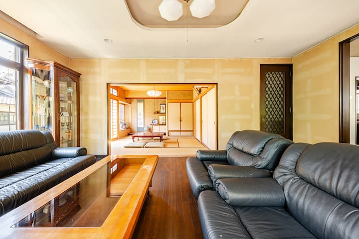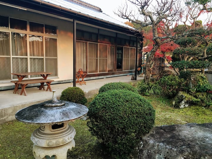 広島駅からわずか20分!200年の歴史がある広大な日本庭園と本格和室のある閑静な一戸建てをまるごと貸し出します。庭園には桜があり、3月の終わりから4月初めはきれいです。ツツジは5月に満開です。広いリビングから庭園が見渡せます。希望者には日本の着物の貸出しと着付け無料サービスあります! 着物を着て伝統的な日本茶の儀式も体験できます!