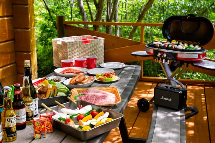 BBQ設備・薪ストーブ設備※利用の際は季節限定・低温サウナ設備・120インチプロジェクターが整った本格ログハウスで「非日常」を楽しめる宿泊体験。