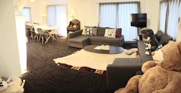 広島市内の中心に位置するこの部屋は、広島市内でも最高のロケーションです。 近くには、コンビニや銀行、飲食店全て揃っています。お部屋の2Fへ3台のクイーンサイズベッド、1Fのリビングへダブルサイズのソファベッド2台を設置しています。 最大10名様までご宿泊可能です。さらにキッチンツールや乾燥機能付きの洗濯機・アイロンもご用意していますので、 中期長期滞在の方も安心してご利用いただけます。