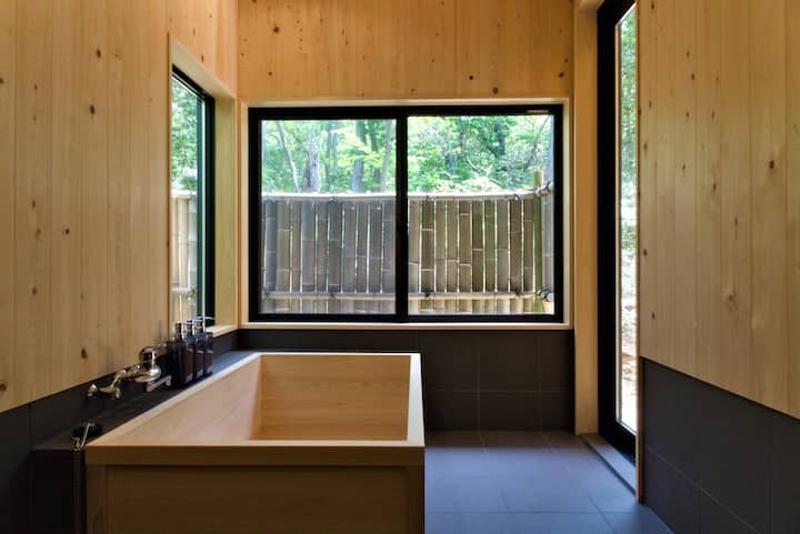天然温泉・ヒノキの半露天風呂付きコテージ