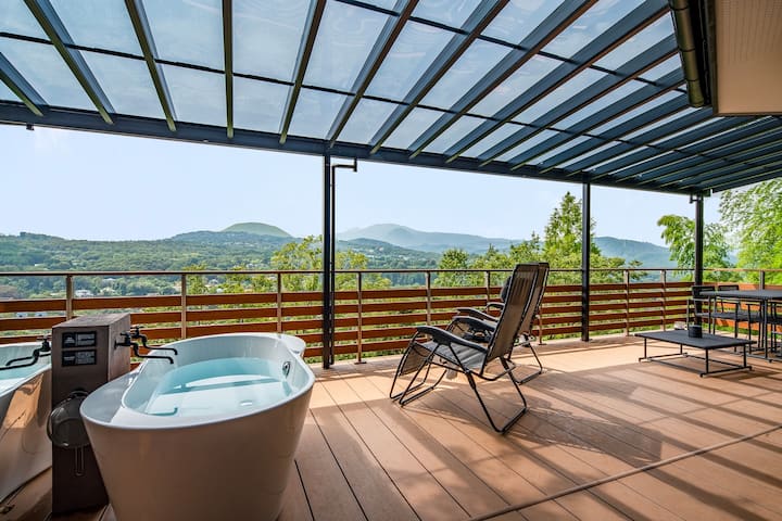 伊東の静かな高台に佇む、雄大な美景が広がる一棟貸し別荘です。眼下には一碧湖、正面には大室山を望む広いウッドデッキテラスがあり、贅沢なひとときをお楽しみいただけます。