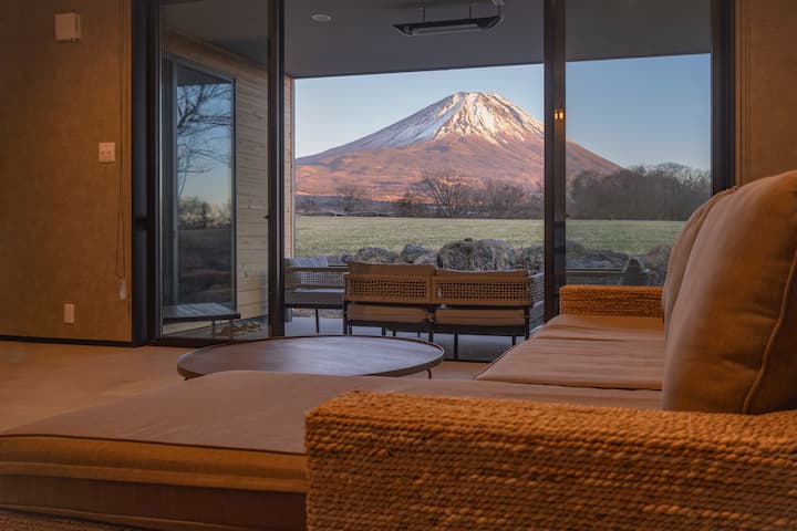森と草原に囲まれた、静かな酪農地域にあるコテージ。リビングや寝室からは、まるで映画のスクリーンのように雄大にそびえる富士山の景色を望むことができます。